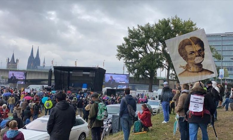 تظاهر الآلاف في مدينة كولونيا الألمانية، السبت، للاحتجاج على قيود الحكومة للوقاية من فيروس كورونا.