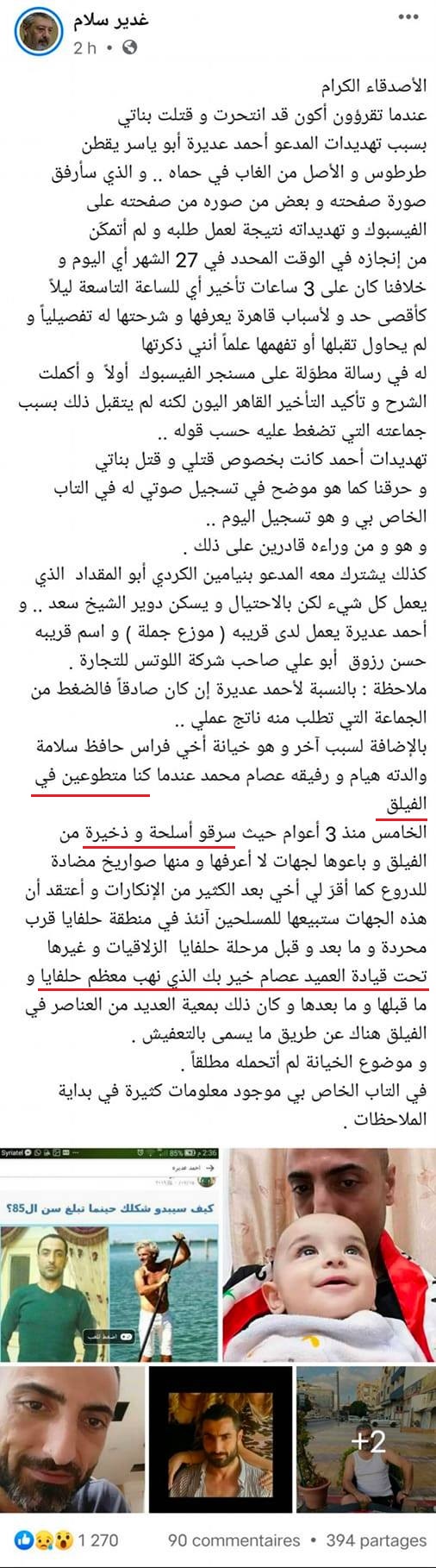 كثير من أصدقاء مدرس الرياضيات والكاتب القصصي (كما يعرف عن نفسه) غدير سلام، كتبوا على صفحته تعليقات يحاولون فيها ثنيه عن ذلك إلا أن الرجل كان نفذ الجريمة فعلا، فيما بدأت صفحات إخبارية وشخصية في المحافظة تؤكد، وتقول إنه فعلا نفذ ما أعلنه، ولم ينج من الأسرة سوى الأم التي نقلت إلى المستشفى.