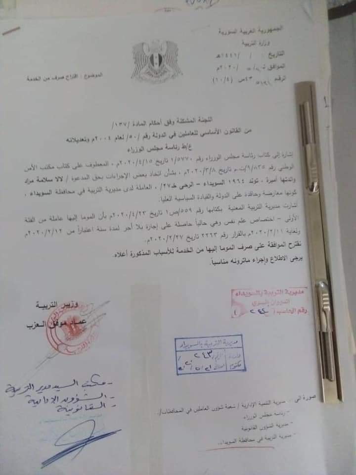 فصلت سلطات بشار الأسد موظفة حكومية، بأمر من “الأمن الوطني” بتهمة “الحقد على القيادة”.