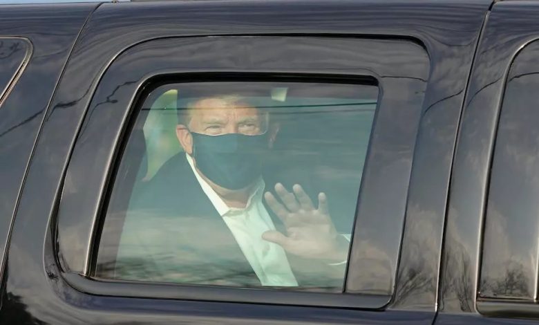 وشوهد ترامب في الموكب واضعا كمامة داكنة وهو يحيي أنصاره، قبل أن يعود إلى المستشفى لمتابعة العلاج.