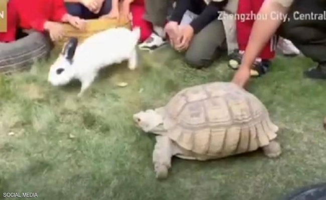 ونشرت شبكة تلفزيون الصين الدولية على حسابها الرسمي في تويتر مقطع الفيديو، يرصد سباقا انتهى بطريقة غير متوقعة بين سلحفاة وأرنب.
