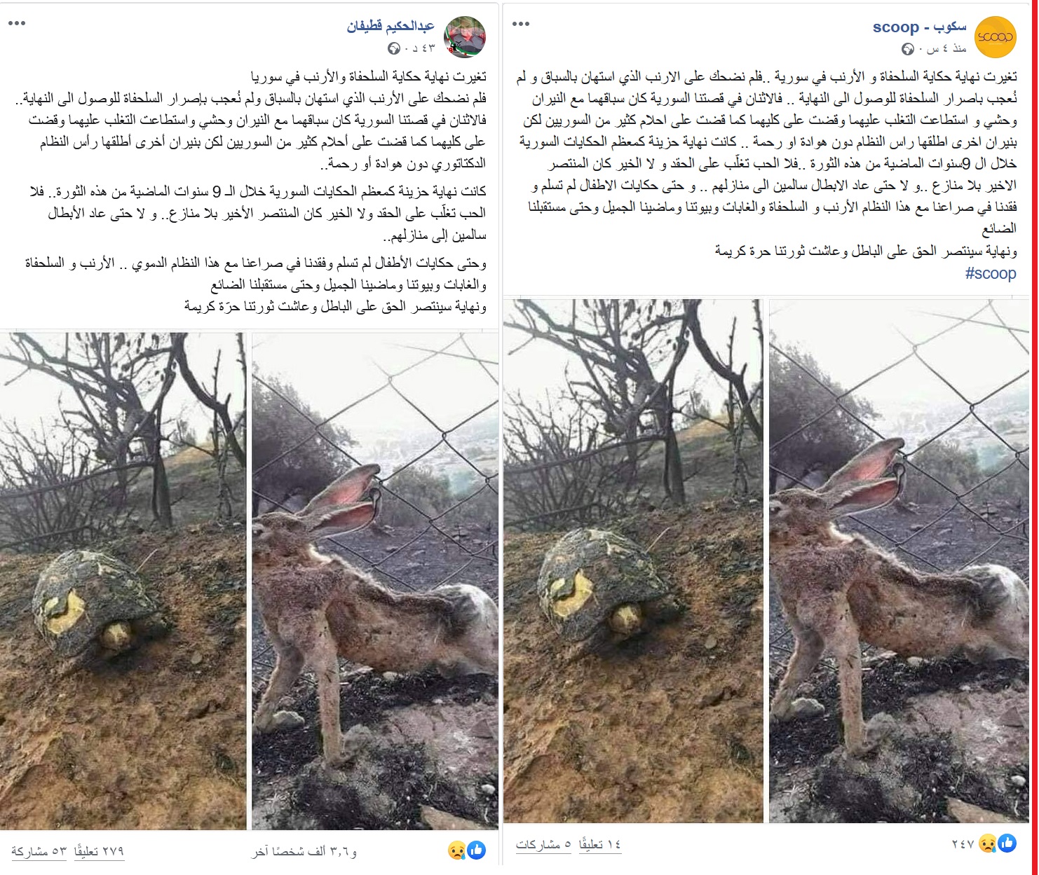 ومن ضمن الصور المنتشرة أيضاً، صور لسلحفاة وأرنب محترقين، إلا أنها هي الأخرى قديمة وليست من سوريا، وقد أشارت وسائل إعلام تركية، بعد أن نُسبت الصور إلى تركيا سابقاً، إلى أن صورة الأرنب تعود للعام الماضي وقد نشرتها وسائل إعلام جزائرية وقالت إنها لمنطقة تيبازة الجزائرية التي شهدت اندلاع حرائق.