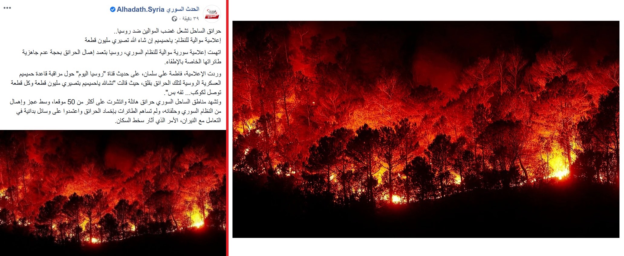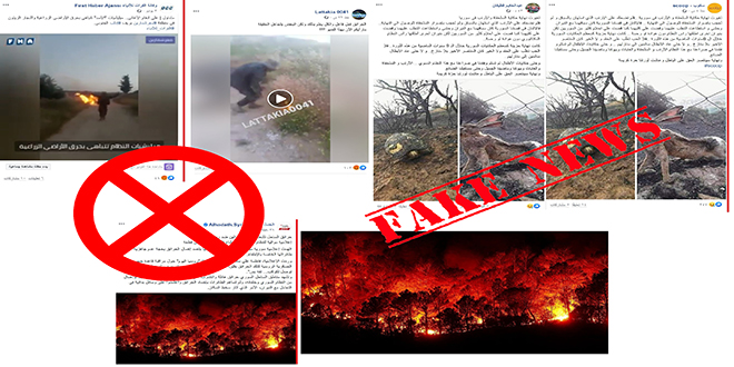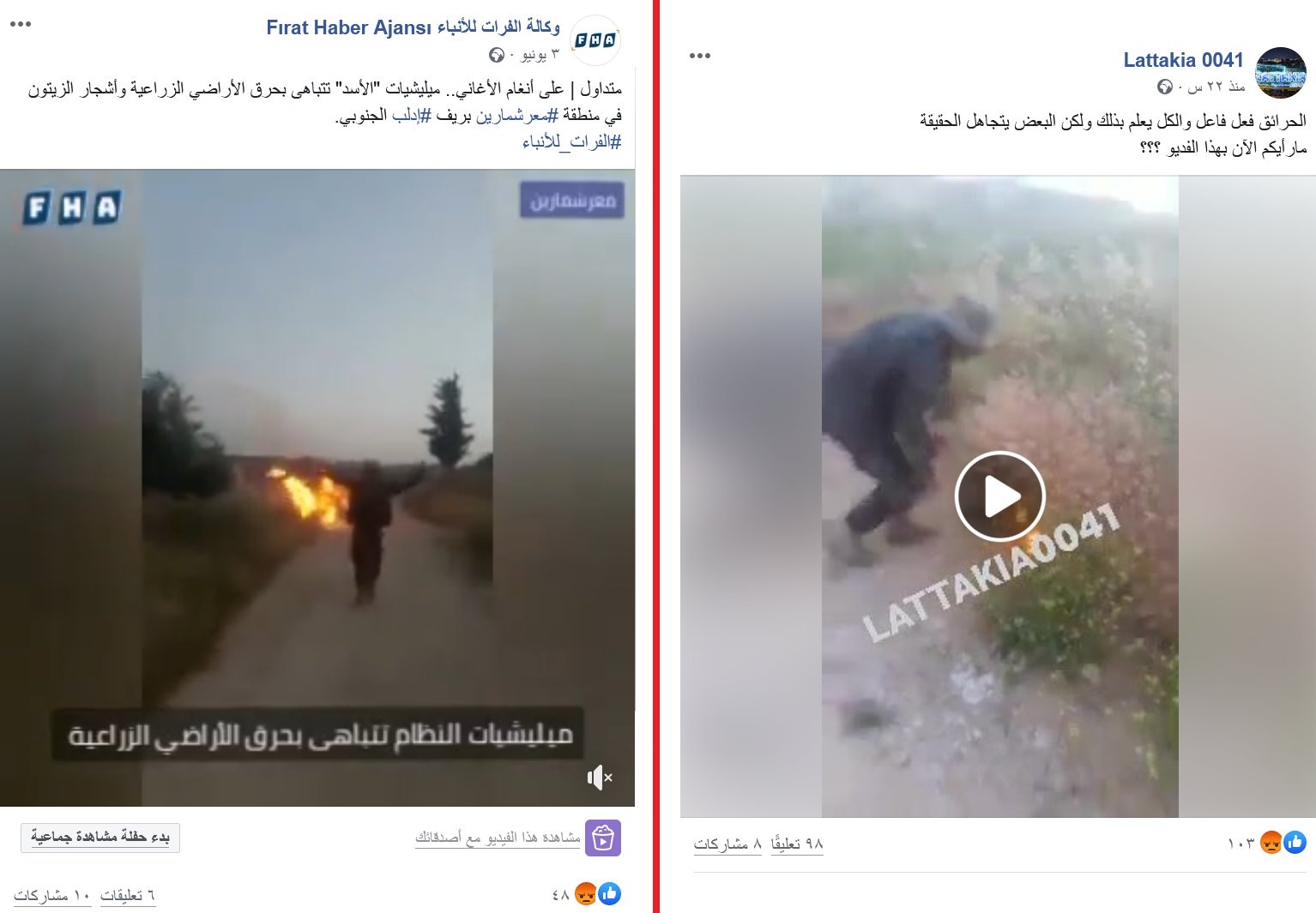 ونشرت صفحات وشبكات إخبارية موالية مقطعاً مصوراً قالت إنه يظهر مفتعلي الحرائق في مناطق الساحل، إلا أن البحث أظهر أن الفيديو قديم ويظهر من قالت مصادر إعلامية محلية معارضة قبل أشهر إنهم عناصر من ميليشيات النظام يقومون بإحراق الأراضي الزراعية في معرشمارين بريف إدلب (خلال الحملة النظامية الأخيرة)، ولم يتسن لعكس السير التحقق من صحة المعلومة الأخيرة من مصادر مستقلة أو موثوقة.