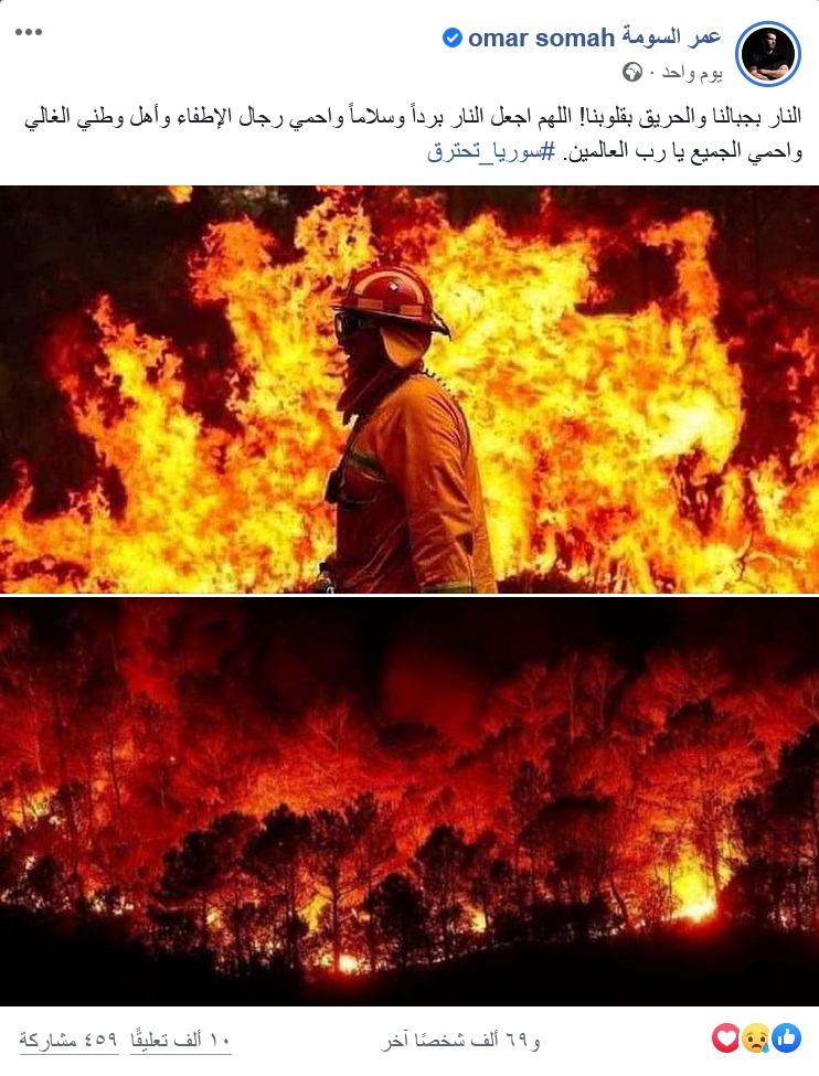 انتشرت خلال الأيام القليلة الماضية العديد من الصور والمقاطع المصورة التي زعم أنها متعلقة بالحرائق التي تشهدها سوريا، إلا أنها ليست كذلك.