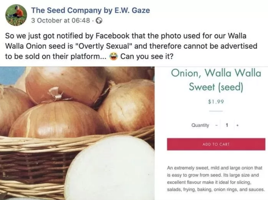 حذف موقع “فيسبوك” إعلانا لإحدى الشركات الكندية، لأحد أنواع البصل الشهيرة، بالخطأ، بعد أن اعتقدت برمجة الموقع أن الصورة تحمل إيحاءات جنسية فاضحة.