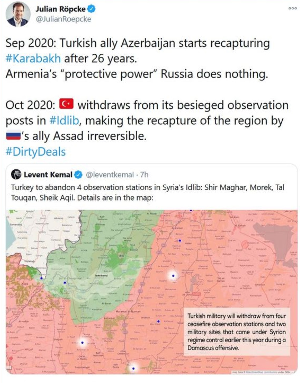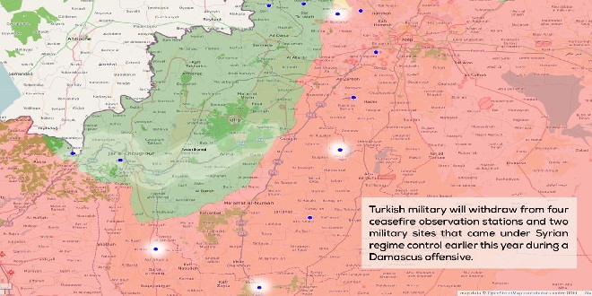 وقال الصحافي التركي ليفينت كمال، عبر حسابه في تويتر، إن تركيا ستنسحب من 4 نقاط مراقبة في سوريا.. شيرمغار – مورك – تل طوقان – الشيخ عقيل، وهي نقاط كانت تركيا أكدت أكثر من مرة أنها لن تنسحب منها.