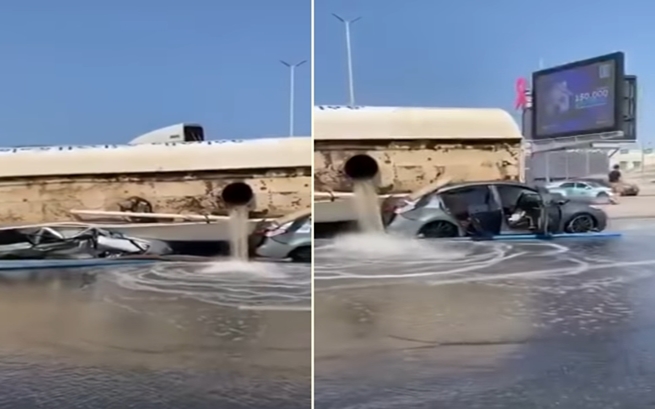 ووفق ما اوردت صحيفة “سبق” السعودية، يبدو في الفيديو صهريج للمياه منقلب على ثلاث سيارات، منها واحدة سقط عليها بشكل كامل وأخرى على أجزاء منها، وتسرب المياه منه على المركبات والشارع.