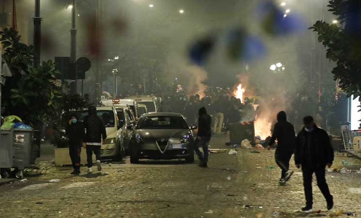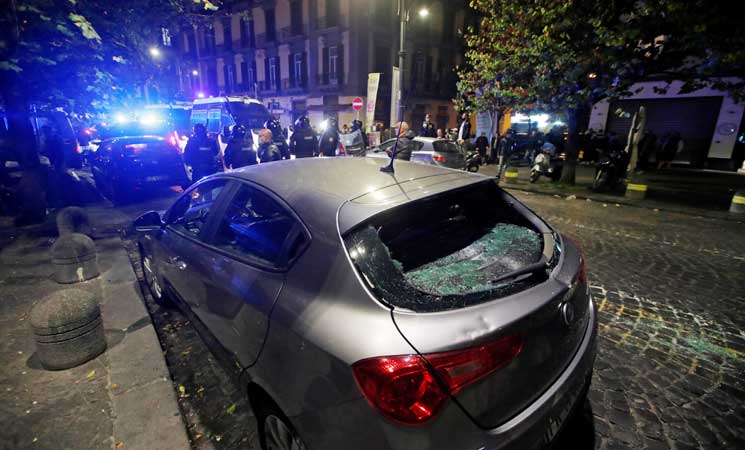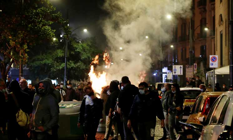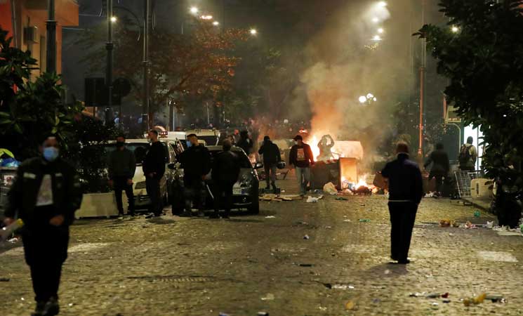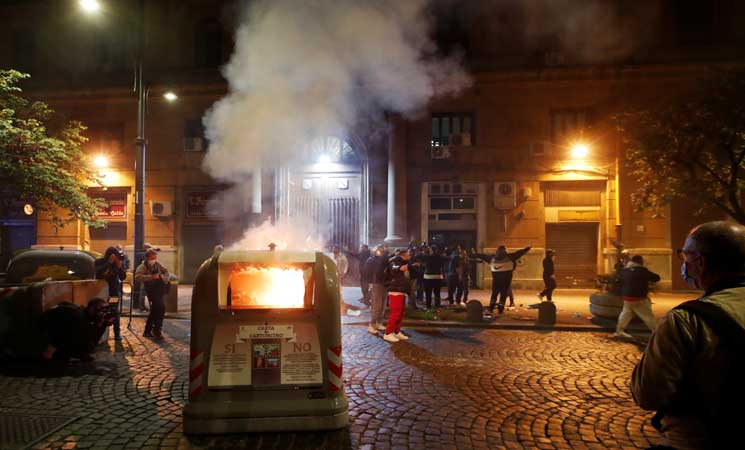 وعند نحو الساعة 23,00 بالتوقيت المحلّي، أي في بداية حظر التجوّل الذي يستمرّ كلّ ليلة حتّى الساعة 5 صباحًا في كامبانيا بمنطقة نابولي (جنوب)، أشعل مئات الأشخاص، معظمهم شبّان، قنابل دخانيّة، وأضرموا نيراناً في مستوعبات القمامة وألقوا مقذوفات على عناصر شرطة مكافحة الشغب المنتشرين في وسط المدينة.