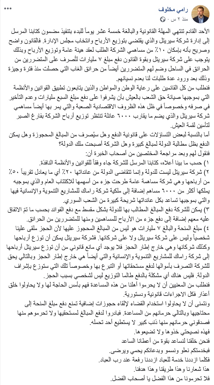 “الأحد القادم تنتهي المهلة القانونية والبالغة خمسة عشر يوماً للبدء بتنفيذ مضمون كتابنا المرسل إلى إدارة شركة سيريتل والذي يقتضي بتوزيع الأرباح وانتخاب مجلس الإدارة. فالقانون واضح وصريح بأنه بإمكان ١٠٪ من مساهمي الشركة الطلب لعقد هيئة عامة وتوزيع الأرباح وبذلك يتوجب على شركة سيريتل وبقوة القانون دفع مبلغ ٧ مليارات لتُصرف على المتضررين من الحرائق في الساحل وضم لهم المتضررين أيضاً من حرائق الغاب التي حصلت منذ فترة وجيزة وذلك بعد ورود عدة طلبات لنا بعدم نسيانهم.