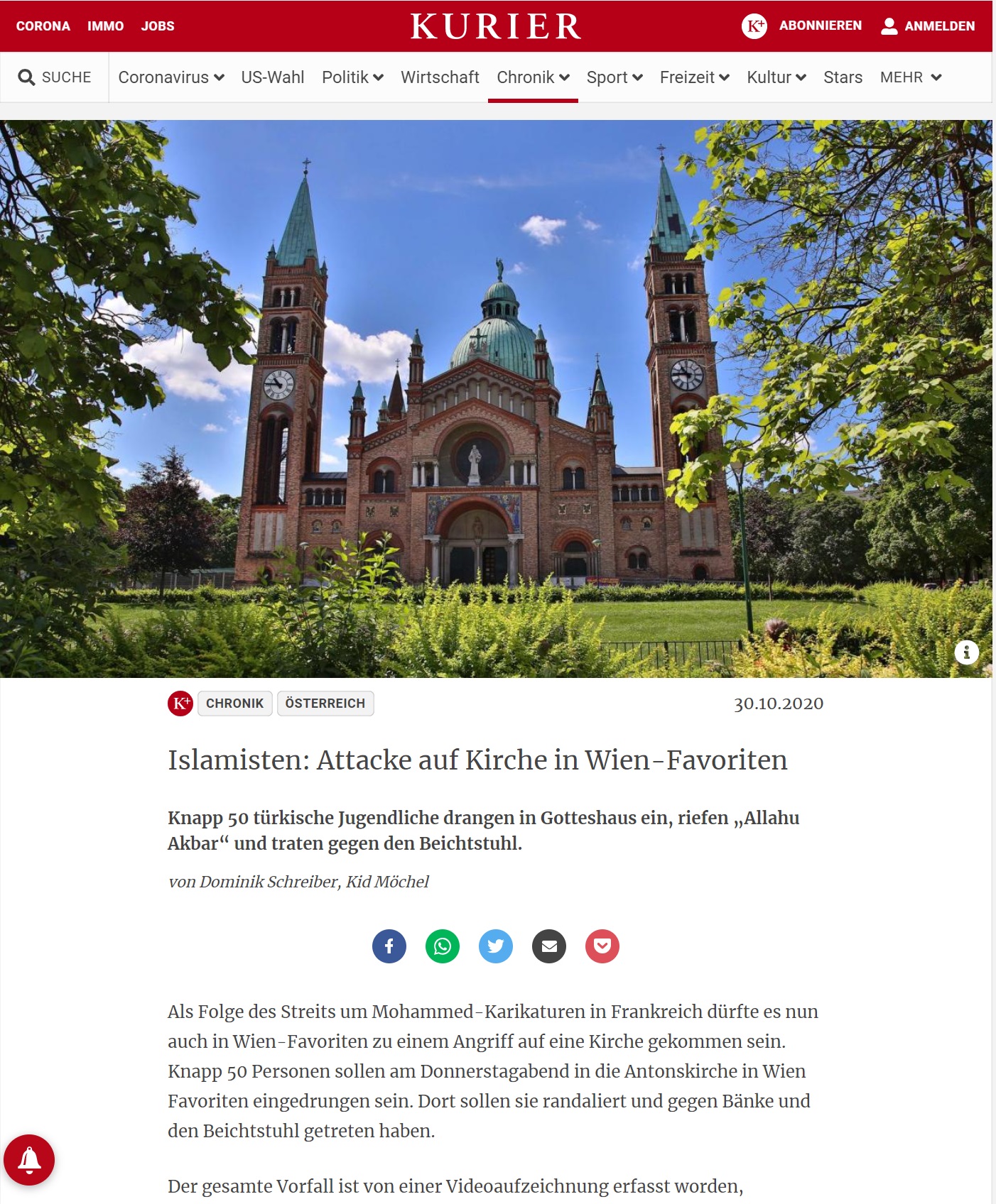اقتحم 30 شابا تركيا كنيسة أنطون في الحي العاشر بالعاصمة النمساوية فيينا ، وهم يرددون هتافات عنصرية وقاموا بأعمال شغب داخل الكنيسة.