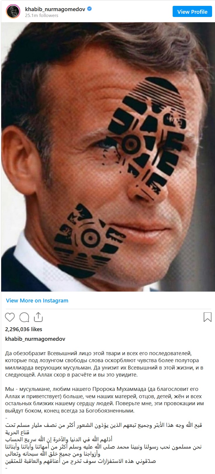وجه الروسي حبيب نورمحمدوف بطل اتحاد ” UFC” للفنون القتالية المختلطة، إهانات للرئيس الفرنسي إيمانويل ماكرون، على خلفية موجة الغضب بسبب الرسوم الكاريكاتورية المسيئة للنبي محمد.