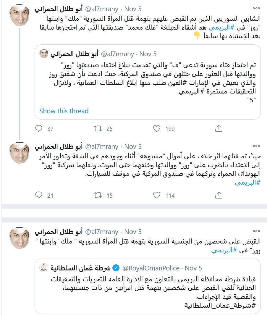 وذكر الإعلامي الكويتي المتخصص بالحوادث والجرائم، أبو طلال الحمراني تفاصيل الجريمة عبر حسابه في تويتر، وقال إن الأجهزة الأمنية بعُمان عثرت على جثة إمرأة سورية تدعى “ف، م” وابنتها مقطعتين في صندوق مركبة نوع هونداي حمراء.