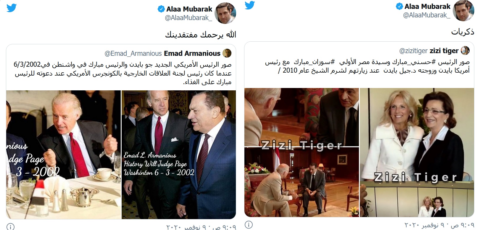 وشارك علاء مبارك متابعي صفحته الرسمية على موقع تويتر صورتين جمعتا حسني مبارك ببايدن حين كان الأخير رئيس لجنة العلاقات الخارجية بالكونغرس عام 2002.