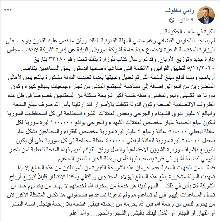 7 مليارات لهذه الفئات .. رامي مخلوف في منشور جديد : الكرة في ملعب الحكومة