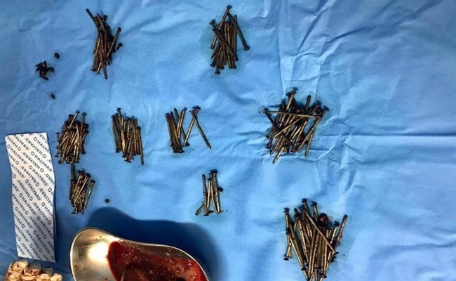 تفاجأ فريق طبي في السعودية بأجسام غريبة في معدة مريض يعاني من آلام وانتفاخ في البطن، قبل أن يتضح لهم أنه ابتلع مئات المسامير وقطع الزجاج، في حادثة نادرة تسبب بها مرض نفسي يعاني منه.