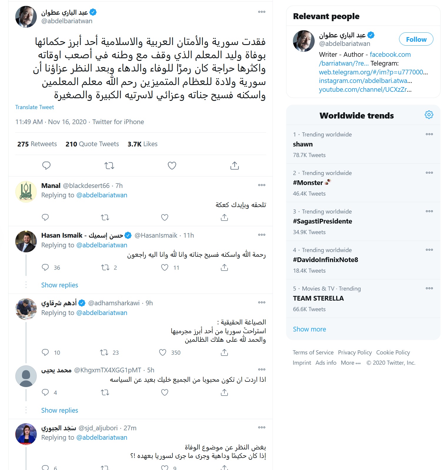 تغريدة “عبد الباري عطوان ” عن وليد المعلم والنعوة التي نشرها على تويتر دليل قاطع على بشاعة وشناعة ما فعله وليد المعلم بسورية وشعبها وحقارة الناعي ..!!