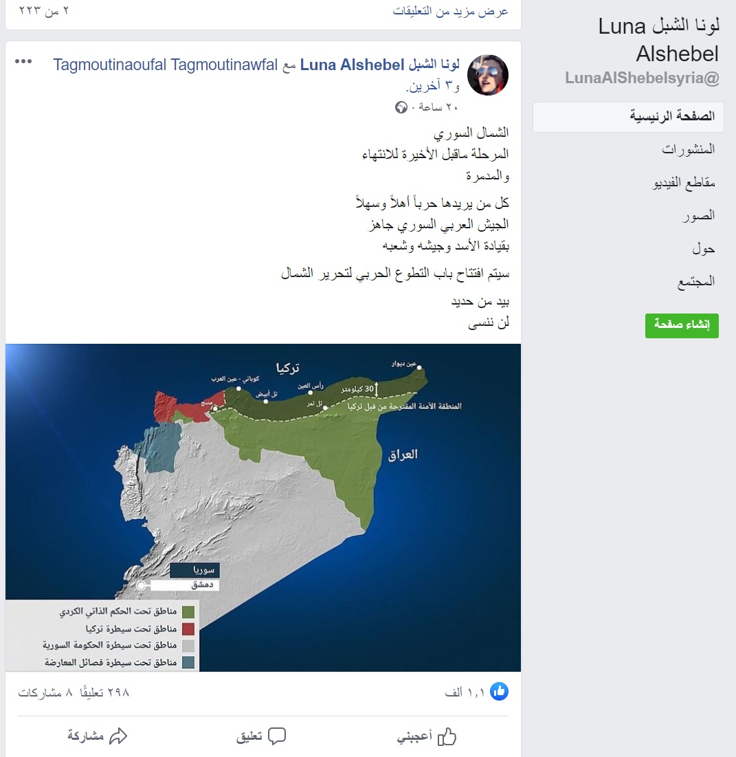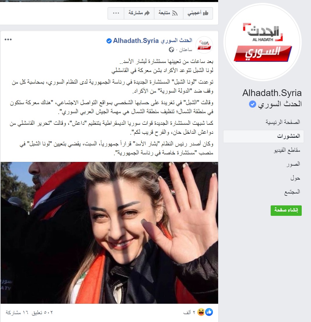 نشرت صفحة “الحدث السوري” المخصصة من قبل قناة العربية لنشر الأخبار المتعلقة بسوريا، خبراً بعنوان “لونا الشبل تتوعد الأكراد بشن معركة في القامشلي”.