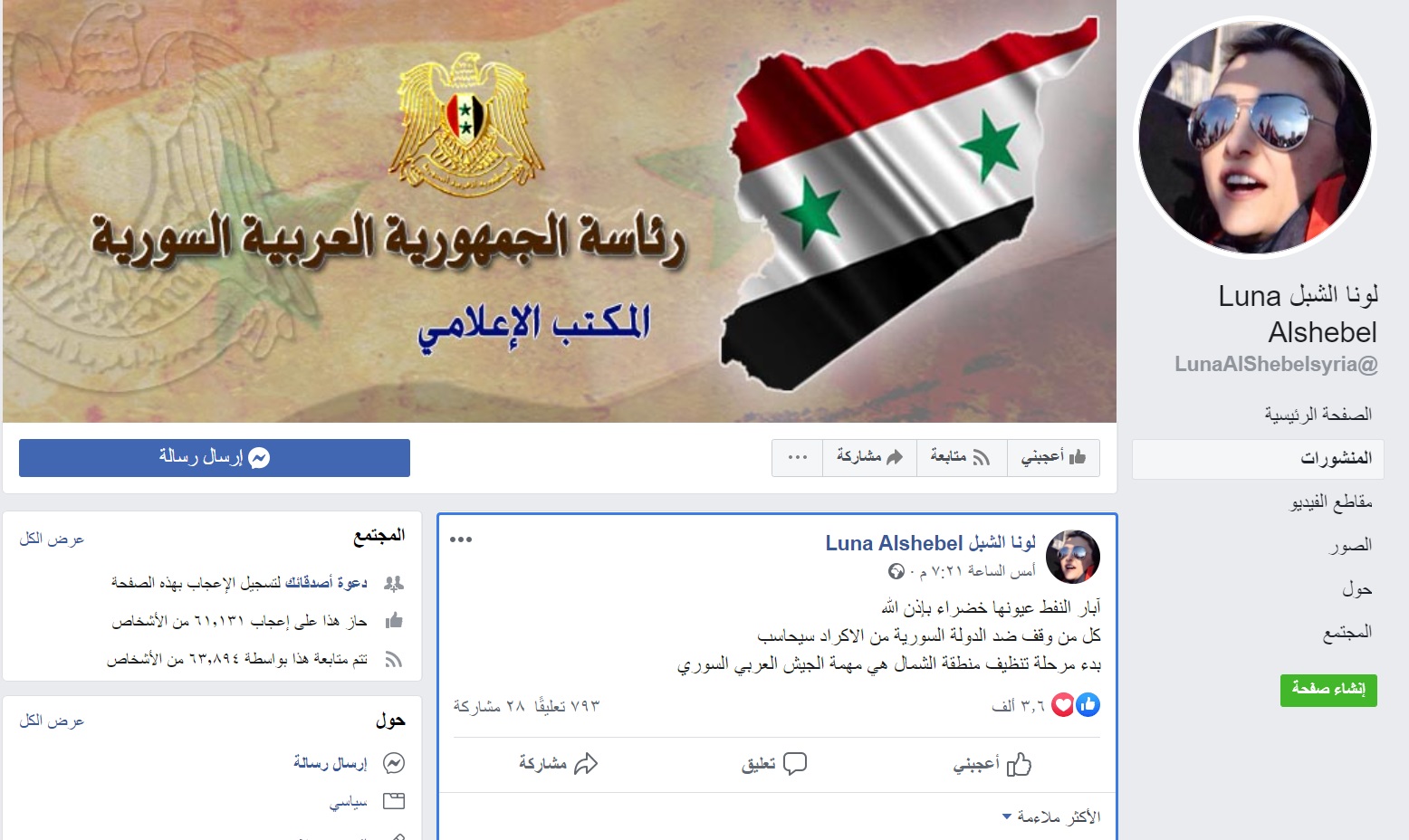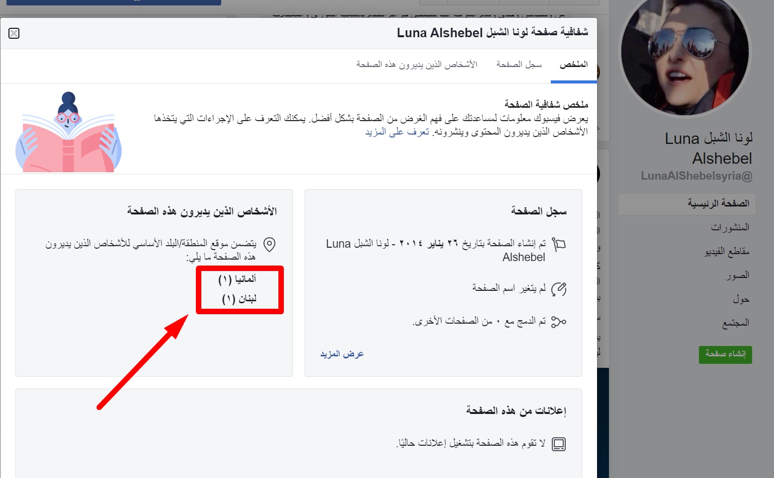 وبحسب مصادر عكس السير، فإن لونا الشبل لا تملك صفحات / حسابات عامة على مواقع التواصل الاجتماعي الأشهر (فيسبوك / تويتر)، وبالاطلاع على الصفحة المزورة التي نسبت صفحة “الحدث السوري” الخبر لها، نجد أنها مدارة من قبل شخصين في ألمانيا ولبنان، وفق ما يظهر بند الشفافية فيها.