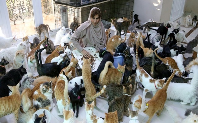 ورغم شكاوى الجيران والنفقات المتزايدة، تقول البلوشي، 51 عاماً، إنّ العيش مع 480 قطة و12 كلباً في الطابق الأرضي من منزلها المؤلف من طابقين، ساعدها على تخطي ظروف قاسية مرت بها في حياتها.