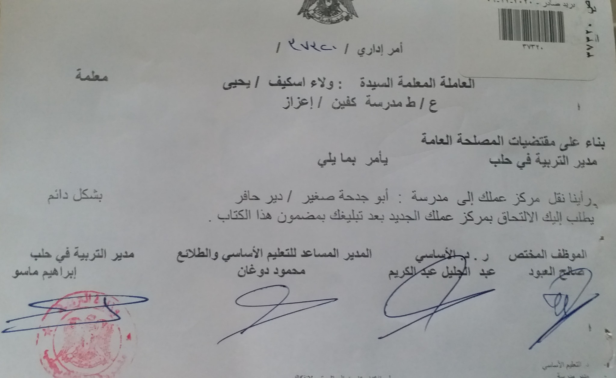 ونقل الإعلام الموالي عن المعلمة ولاء اسكيف قولها، إنها “فوجئت في اليوم التالي بصدور قرار بنقلها إلى قرية أبو جدحة قرب دير حافر بشكل دائم، والتي تبعد عن مدينة حلب حوالي 90 كيلو متراً”.