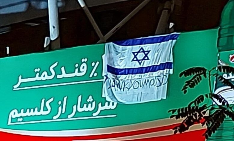 نشر ناشطون على وسائل التواصل الاجتماعي صورا وفيديوهات لعلم إسرائيل مرفوعا على جسر مشاة في حي طهران بارس شرقي العاصمة ومكتوبا تحته بالإنجليزية “شكرا أيها الموساد”.