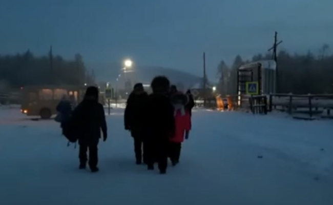 يُظهر مقطع فيديو الصغار المدثرين بإحكام، وهم يقفون بانتظار حافلة في صباح شديد القتامة، قبل أن يسيروا بقية المسافة في درجات حرارة تبلغ 51 درجة مئوية تحت الصفر (-60 فهرنهايت) بقرية أويمياكون السيبيرية.