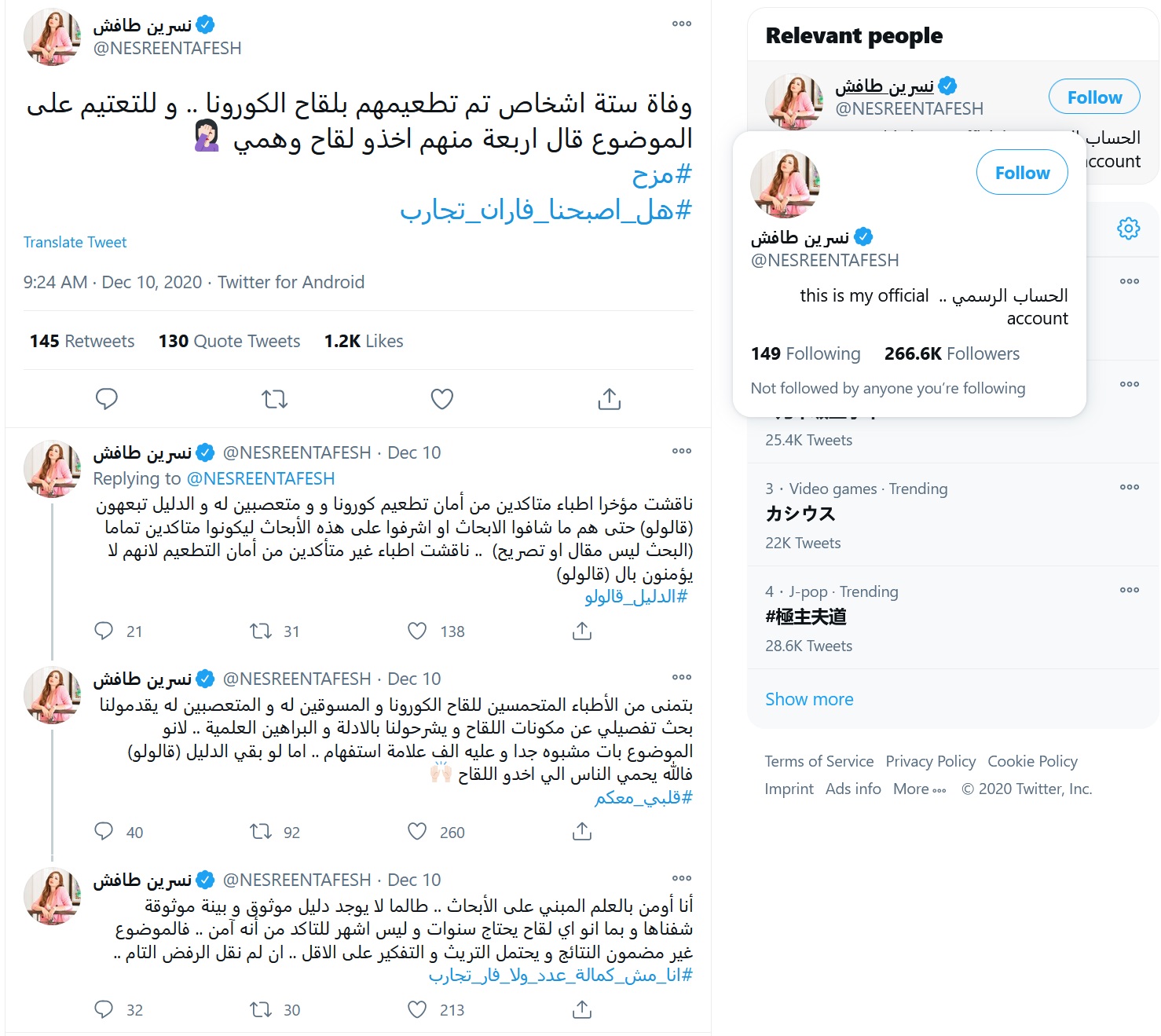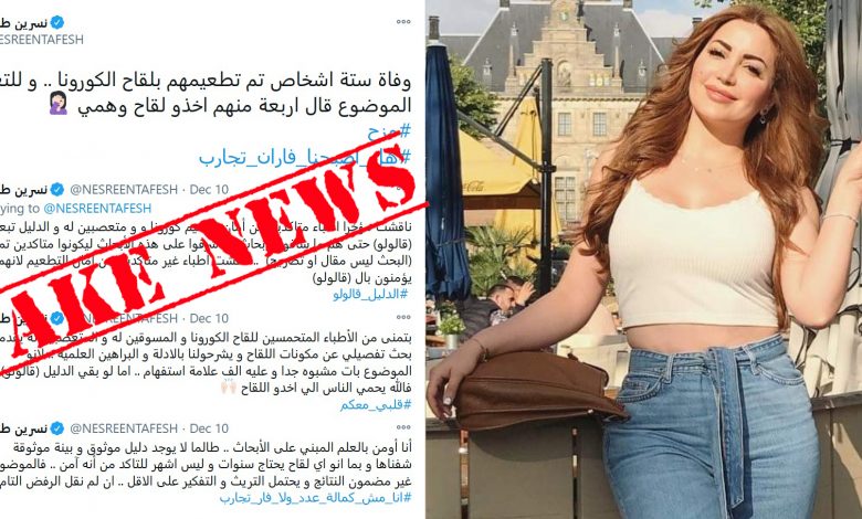 نشرت الممثلة نسرين طافش عبر حسابها في تويتر معلومات مضللة عن لقاح كورونا وشككت بدراسات العلماء وزعمت أن الموضوع بات مشبوهاً جداً وعليه إشارات استفهام وغير مضمون.