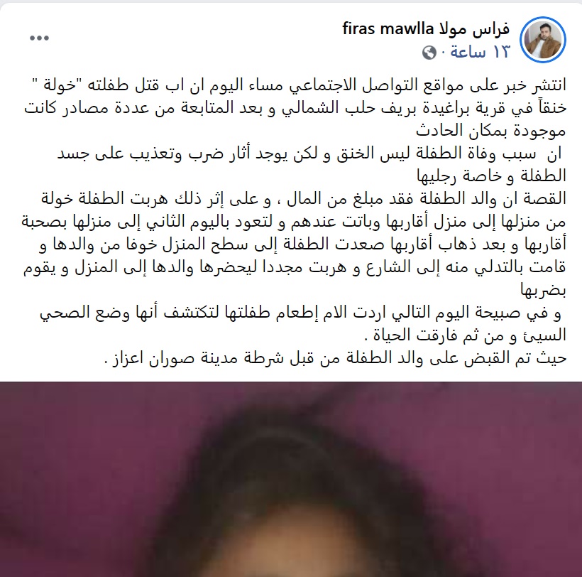 وذكر الناشطون أن الطفلة (10 سنوات) قتلت خنقاً على يد والدها بعد أن اكتشف أنها أخذت أموالاً من ملابسه، ولم يتسن لعكس السير التحقق من صحة هذه المعلومة من مصادر مستقلة أو موثوقة.