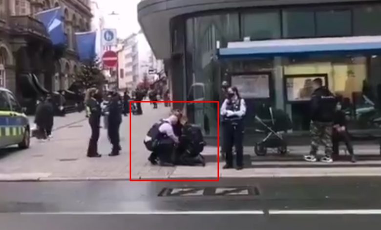 انتشر على وسائل التواصل فيديو يظهر امرأة ترتدي حجاباً وهي ملقاة على الأرض وعناصر من الشرطة الألمانية تكبل يديها. وإلى جانب السيدة يشاهد المرء عربة طفلها.