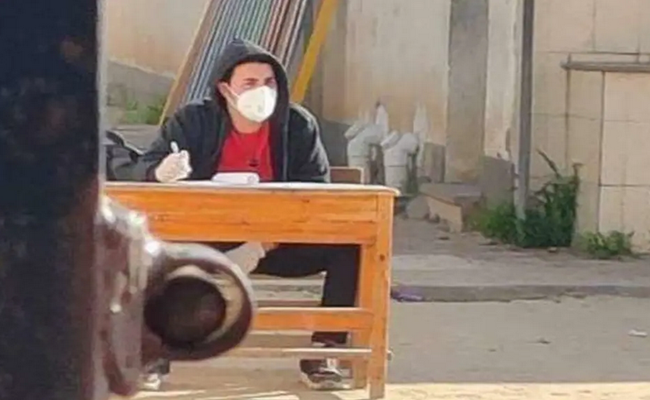 تداول رواد مواقع التواصل الاجتماعي في مصر صورة لأحد الطلاب يؤدي امتحانا في فناء المدرسة بإحدى المدارس التجريبية بإدارة شرق إسكندرية التعليمية بزعم أن الطالب مصاب بكورونا.