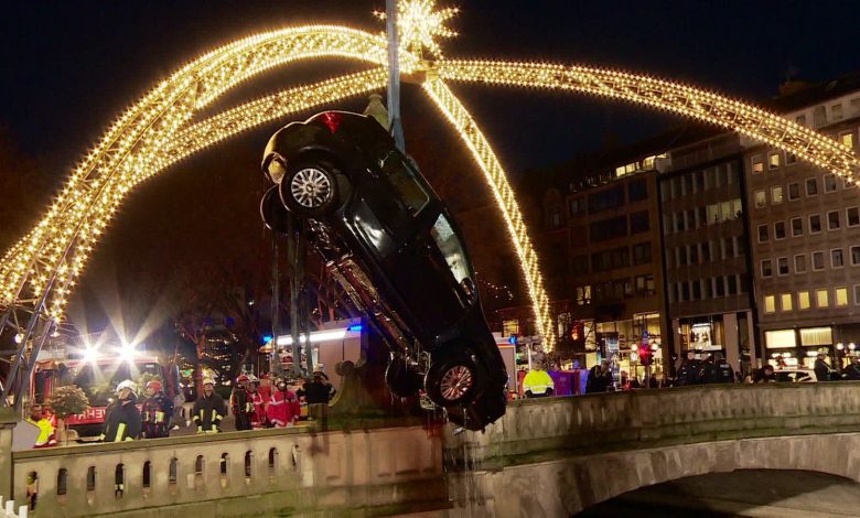 فقد رجل السيطرة على سيارته وسط مدينة دوسلدورف، غربي ألمانيا، فسقط بسيارته في نهر، لكن الرجل أنقذ نفسه بالطفو على السطح.