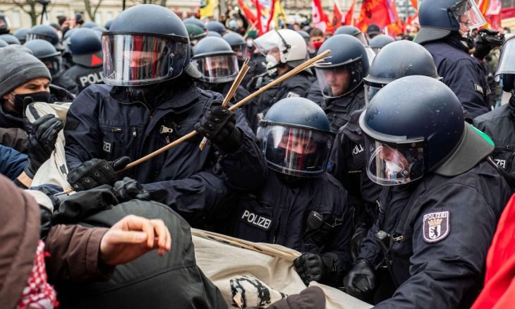 وجاء تدخل الشرطة الألمانية في المظاهرة إثر رفع متظاهرين شعارات محظورة لحركات يسارية.