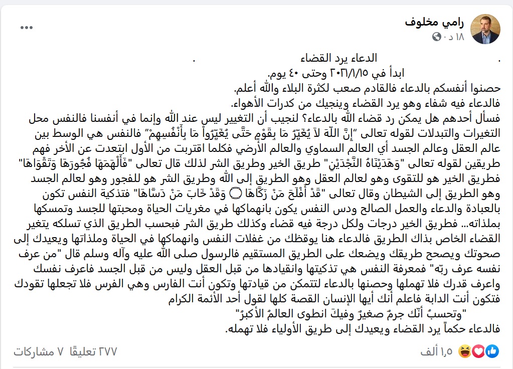وجاء في منشور لمخلوف عبر صفحته، صباح الخميس: “الدعاء يرد القضاء.. ابدأ في ٢٠٢١/١/١٥ وحتى ٤٠ يوم.. حصنوا أنفسكم بالدعاء فالقادم صعب لكثرة البلاء والله أعلم.. فالدعاء فيه شفاء وهو يرد القضاء وينجيك من كدرات الأهواء.