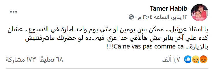 وكتب حبيب، الثلاثاء، عبر حسابه على موقع التواصل الاجتماعي فيسبوك قائلا: “يا استاذ عزرائيل، ممكن بس يومين أو حتي يوم واحد إجازة في الأسبوع.. عشان كده على أخر يناير مش هلاقي حد أعزي فيه.. ده لو حضرتك ماشرفتنيش بالزيارة”.