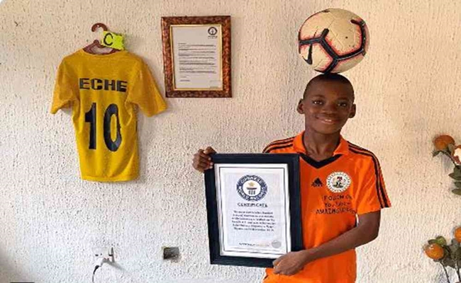 حقق الطفل النيجيري “إيشيى شينوسو”رقما قياسيا جديدا لأكثر اللمسات المتتالية من كرة القدم في دقيقة واحدة أثناء وضع كرة أخرى على رأسه.