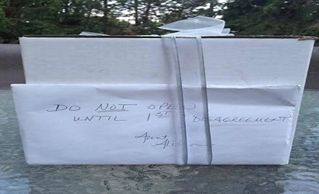 وكان الزوجان كاثي وبراندون غن من ميتشغان قد عقدا قرانهما بحضور الأهل والأصدقاء، وحصلا على هدية غريبة من أليسون عمة كاثي، وحملت الهدية ملاحظة كتبت العمة فيها “لا تفتحا الهدية قبل الخلاف الأول بينكما”.