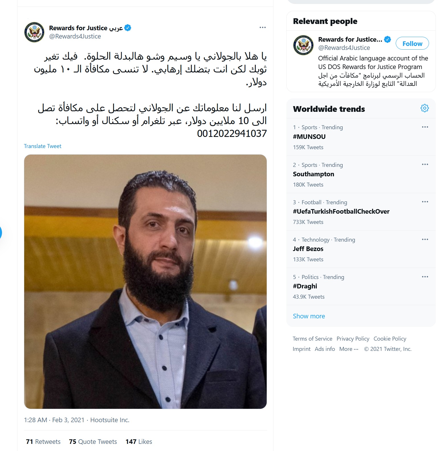 سخر الحساب الرسمي لبرنامج “مكافآت من أجل العدالة” من الظهور الأخير للجولاني، إلى جانب صحافي أمريكي أجرى لقاء معه في إدلب.