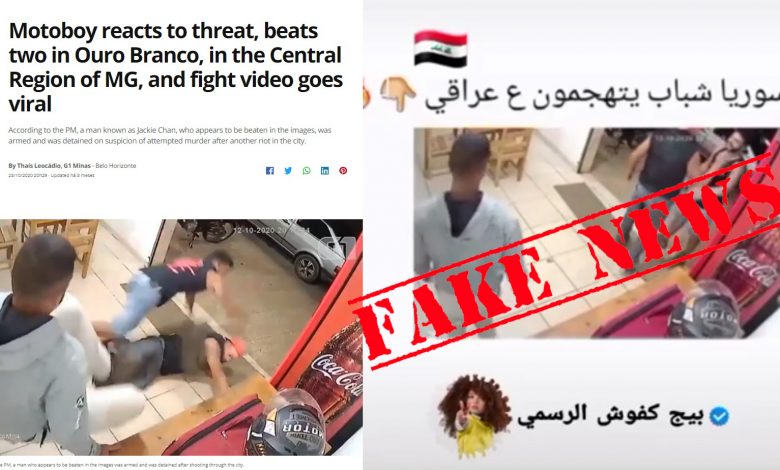 تداول مستخدمون لمواقع التواصل الاجتماعي فيديو قيل إنه يظهر شاباً عراقياً تعرّض لاعتداء من شابين في سوريا فأشبعهما ضرباً. لكن الفيديو في الحقيقة يُظهر حادثة وقعت في البرازيل ولا شأن للعراق وسوريا بها.