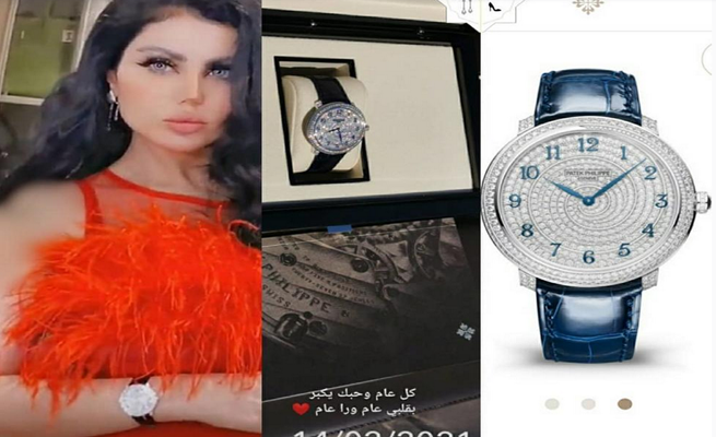 حليمة بولند نشرت صورة تستعرض فيها ساعة يد مُرصعة بالألماس، وعلقت على الصورة قائلة: “لا خلا لا عدم يا حبي الأبدي، الساعة من ماركة Patek Philippe الساعة مصنوعة من الذهب الأبيض 18 قيراط ومرصعة بـ770 قطعة ألماس على شكل شريط حلزوني”.