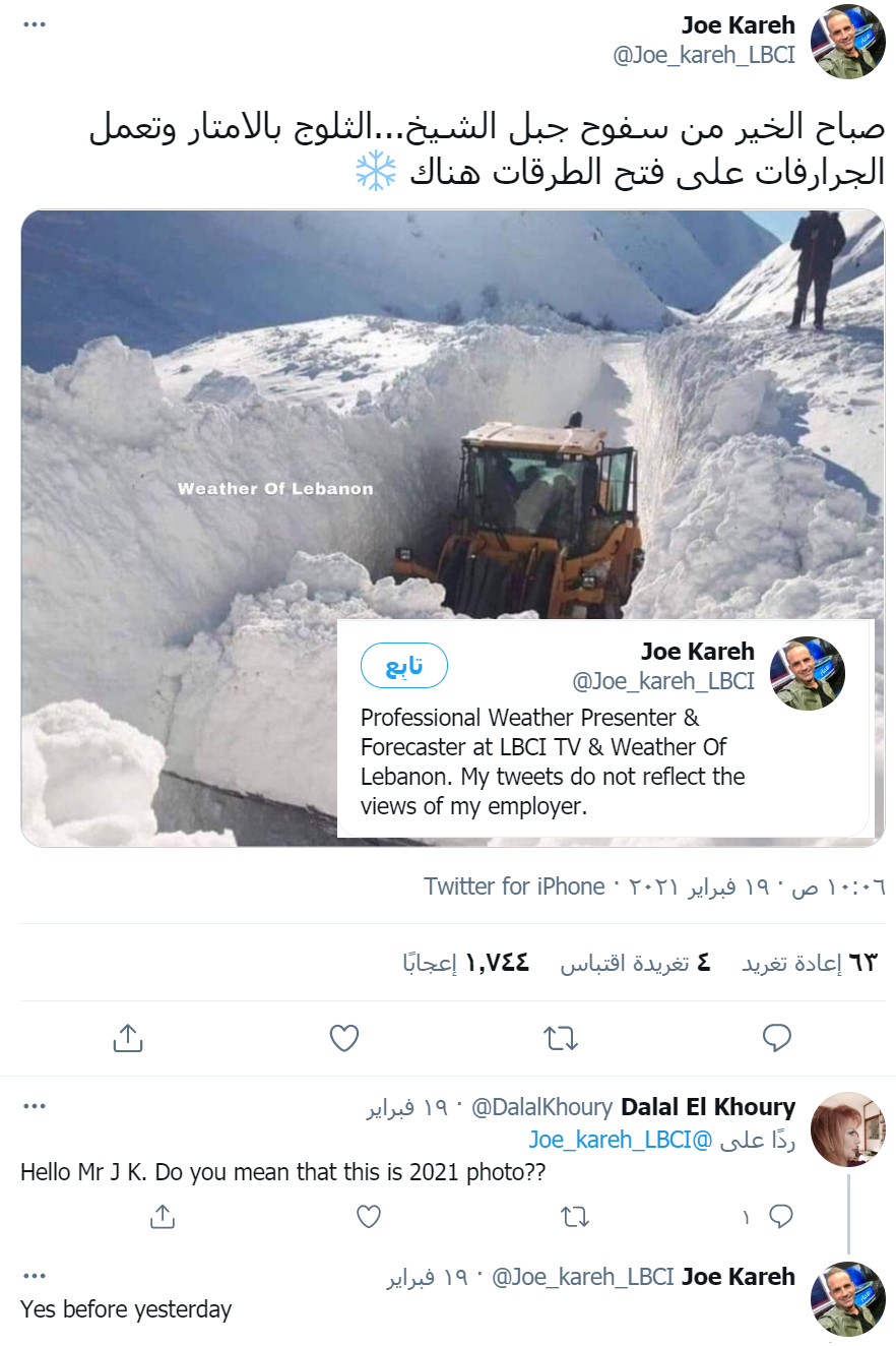 تداولت مصادر لبنانية وسورية صورة لجرافة تزيل الثلوج، على أنها في سوريا ولبنان، وأن ارتفاع الثلوج وصل إلى 6 أمتار.