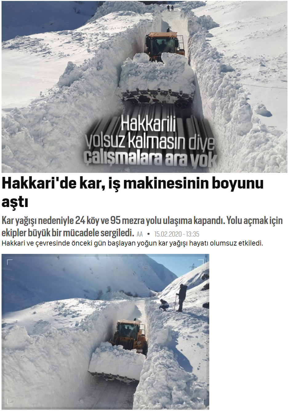 وبلغ ارتفاع الثلوج حينها مترين، في المناطق المرتفعة من هكاري، وتسببت بإغلاق العديد من الطرق وانقطاع الوصول للعديد من القرى.