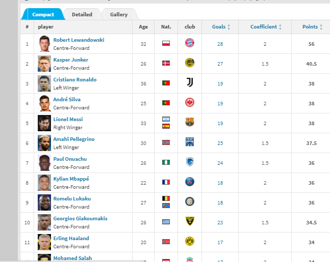 وتقدم الثنائي الأرجنتيني ليونيل ميسي، نجم برشلونة ومتصدر ترتيب هدافي الدوري الإسباني، والبرتغالي كريستيانو رونالدو، نجم يوفنتوس ومتصدر ترتيب هدافي الدوري الإيطالي، للمركز الثالث رفقة البرتغالي أندري سيلفا، مهاجم فرانكفورت، ووصيف ليفاندوفسكي في الدوري الألماني.