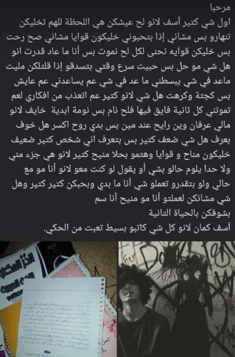 وأضافت أن شمص “كان صاحب موهبة في الرسم والتصوير، كما يبدو واضحاً من صفحته الشخصية، ووصفه كثر من أصدقائه بأنه مبدع وفنان، محملين الظروف في البلد مسؤولية اتخاذ حسين لقرار انتحاره، وتنفيذه يوم أمس الأربعاء، أو الأربعاء الأسود كما وصفه أصدقاء الشاب الراحل”.