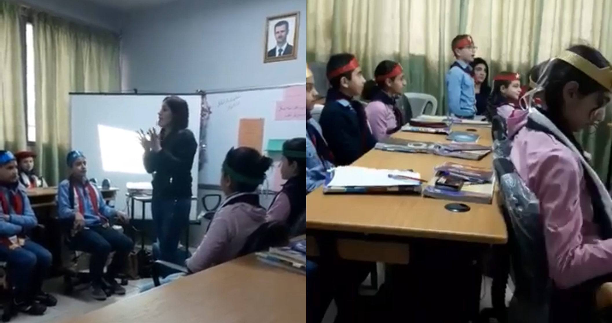 نشرت صفحة مدرسة سورية ابتدائية، في فيسبوك، مقطعاً مصوراً يظهر معلمة تلقن التلاميذ جمل مديح وإقرار بالطاعة والإخلاص لبشار الأسد، في مشهد مؤذ يكشف ما يتعرض له الأطفال من غسيل للأدمغة في المدارس التي يديرها حزب البعث الذي يفترض أنه لم يعد، وفق الدستور “القائد للدولة والمجتمع”.