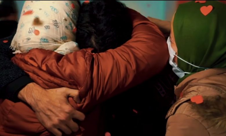 وضمت الأم ابنها إلى حضنها وكان عناق الأسرة حارا وسط مشهد عاطفي وإنساني مؤثر.