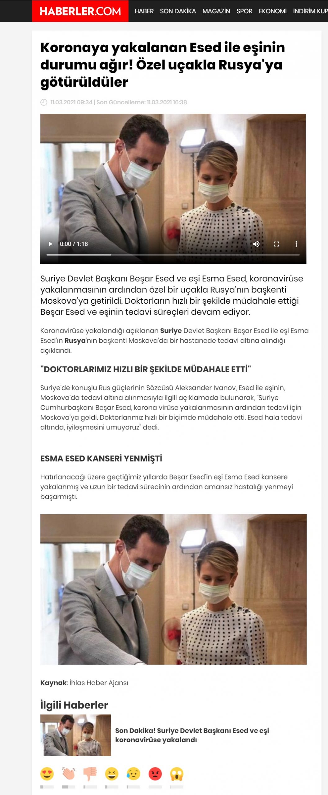 نشرت وسائل إعلام تركية وعنها نقل ناشطون سوريون خبراً يزعم أن بشار وأسماء الأسد نقلا إلى روسيا لتلقي العلاج بعد إصابتهما بفيروس كورونا.