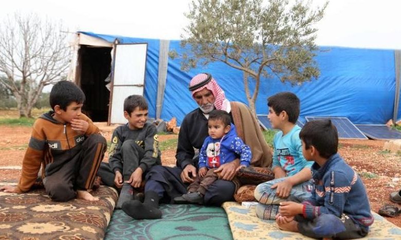 بعد رحلات نزوح متعددة قادته من مسقط رأسه في محافظة حماة (وسط) إلى إدلب (شمال غرب)، يستقر عبد الرزاق محمّد خاتون (83 عاماً) مع عائلة مؤلفة من ثلاثين فرداً، في أربع خيم شيدها على أرض زراعية استأجرها بين أشجار الزيتون في بلدة حربنوش القريبة من معرة مصرين في ريف إدلب الشمالي.