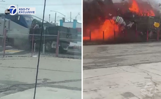 قطار سريع يسحق شاحنة و يتسبب بانفجارها في الولايات المتحدة ( فيديو )