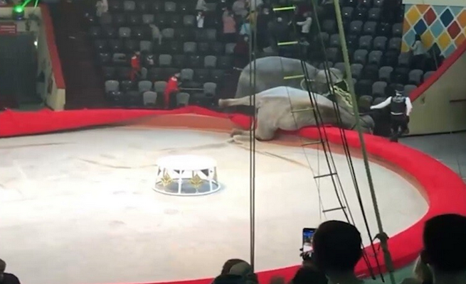 وقع عراك الفيلة في العرض الصباحي بسيرك مدينة قازان الروسية حيث اعتدى فيل على أخر، ما أدى إلى سقوط أحدهما على الحلبة.