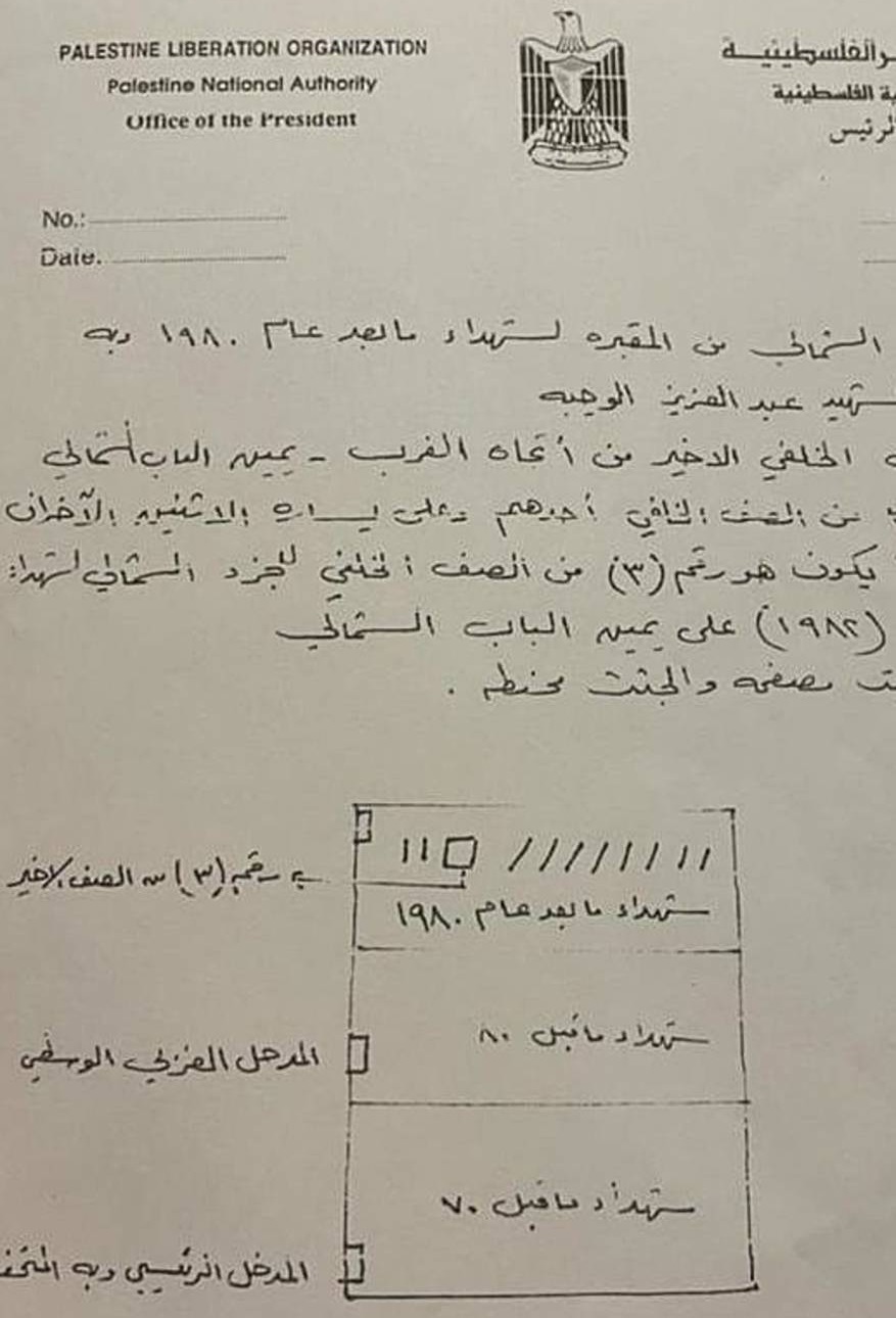 ونقلت مجموعة العمل من أجل فلسطينيي سوريا عن موقع “واللا” الإسرائيلي قوله إن “وثيقة كتبت بخط يد الرئيس الفلسطيني الراحل، ياسر عرفات، أشارت إلى ثلاثة قبور في مقبرة مخيم اليرموك للاجئين الفلسطينيين في دمشق”.